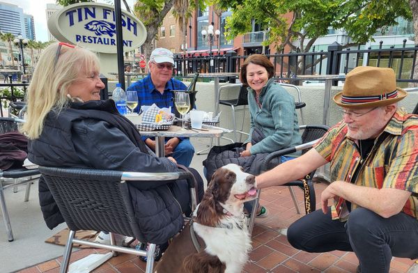Joe Rathburn pets Lola at a Tin Fish table filled by Pomela Flanigan, Chris Flanigan and Carolyn Forte. |